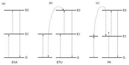 無機(jī)材料有三個(gè)基本發(fā)光原理:激發(fā)態(tài)吸收(Excited-state absorption, ESA),能量傳遞上轉(zhuǎn)換(Energy transfer upconversion, ETU)和光子雪崩(Photon avalanche, PA)。