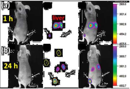 上轉(zhuǎn)換發(fā)光納米材料(UCNPs)具有熒光壽命長、潛在生物毒性低、穿透深度大、對生物組織損傷小且?guī)缀鯖]有背景光等顯著優(yōu)點(diǎn),近年來在生物成像及生物檢測等領(lǐng)域已經(jīng)得到廣泛應(yīng)用,下圖未上轉(zhuǎn)換納米顆粒在生物活體中進(jìn)行腫瘤標(biāo)記。