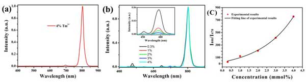Figure 10(a)是NaYF4: 20%Yb3+, 4%Tm3+的上轉(zhuǎn)換發(fā)射譜,只看到一個(gè)800nm下的發(fā)射峰,是高對比度深層組織熒光成像的理想情況。Figure 10(b)通過調(diào)節(jié)Tm3+的摻雜濃度來研究此現(xiàn)象的物理機(jī)理,數(shù)據(jù)中通過對800nm的發(fā)射進(jìn)行強(qiáng)度歸一化之后,發(fā)現(xiàn)470nm的發(fā)射峰隨著Tm3+的濃度增加,強(qiáng)度減弱。在Figure 10(c)上可以看到I800/I470比值隨著Tm3+摻雜濃度的增加,呈指數(shù)增長。