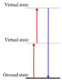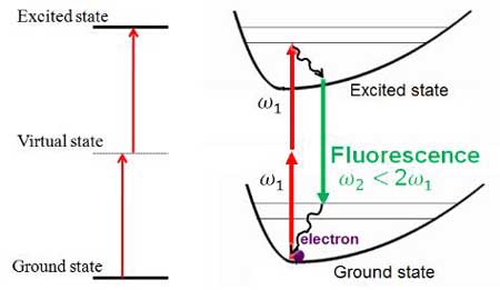 產(chǎn)生原理:熒光分子吸收第一個(gè)光子后,躍遷到虛能級(jí)上,該能級(jí)僅能存在幾飛秒,便自動(dòng)返回基態(tài),第二個(gè)光子必須在這幾飛秒內(nèi)與虛能級(jí)上的分子作用,從基態(tài)躍遷到激發(fā)態(tài)(下圖左),能量較大的激發(fā)態(tài)分子,通過無輻射躍遷和熒光發(fā)射使自己回到最低電子激發(fā)態(tài)的最低振動(dòng)能級(jí)(下圖右)。