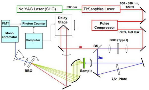 下方為飛秒熒光上轉(zhuǎn)換裝置原理圖:飛秒激光其的激光脈沖經(jīng)過分束片分成兩束,一束激光脈沖用來激發(fā)樣品發(fā)射熒光,并把熒光收集后匯聚到BBO(偏硼酸鋇)晶體上,另一束光作為快門,門控光脈沖經(jīng)過光學(xué)延遲線,也匯聚到BBO上。然后記錄樣品受激發(fā)之后不同時(shí)刻熒光強(qiáng)度信息。