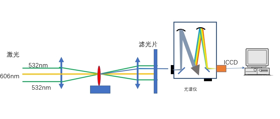 如果將染料激光器引入實(shí)驗(yàn),在Nd:YAG 激光器后面接上染料激光器,用532nm泵浦我們可獲得多個(gè)波段的激發(fā)激光,例如606nm的激光,然后經(jīng)與兩束532nm激光在時(shí)域上進(jìn)行調(diào)整,在滿足CARS的相位匹配條件下,我們可以得到相關(guān)的CARS信號(hào),從而可以用來分析燃燒場的溫度和組分濃度信息。