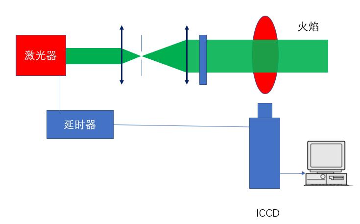 在燃燒過程中,燃燒不充分會(huì)產(chǎn)生很多中間產(chǎn)物,我們也可以用激光激發(fā)火焰中這些中間產(chǎn)物獲得熒光來分析,也就是激光誘導(dǎo)熒光(LIF),如果將激光經(jīng)過柱面鏡等光學(xué)元件整形成很薄的一個(gè)平行平面光,這是我們稱該實(shí)驗(yàn)為平面激光誘導(dǎo)熒光(PLIF)