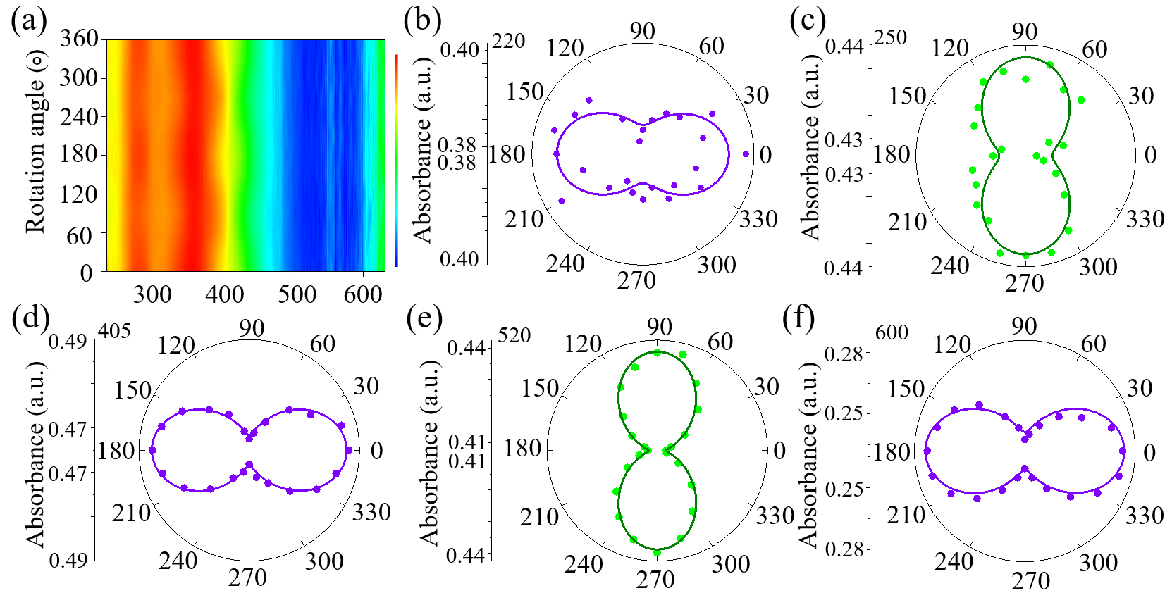 圖2. (a)偏振光吸收圖。偏振光吸收的極坐標圖:(b)220 nm;(c)250 nm;(d)405 nm;(e)520 nm;(f)600 nm。