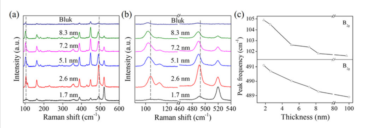 拉曼光譜用于分析PdPS光學性質(zhì),如圖4a,b為不同層的拉曼光譜信息,隨著層數(shù)增加,102cm-1和489cm-1的拉曼譜峰發(fā)生紅移。峰位與溫度的依賴性如圖4c所示。