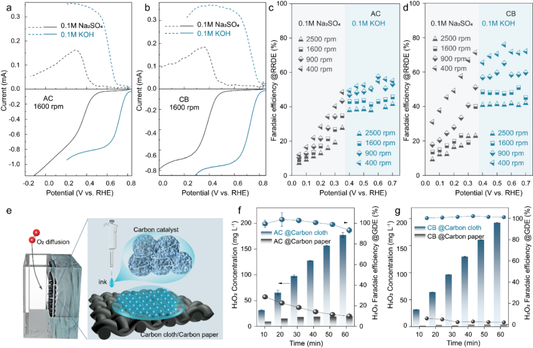 實驗時首先制備了三種典型的碳基催化劑,通過RRDE表征其ORR動力學。實驗表明低轉速、堿性電解液中三種材料均具有更高的H2O2合成選擇性; ORR反應過程中三種碳基催化劑的H2O2合成選擇性具有明顯的pH依賴性。