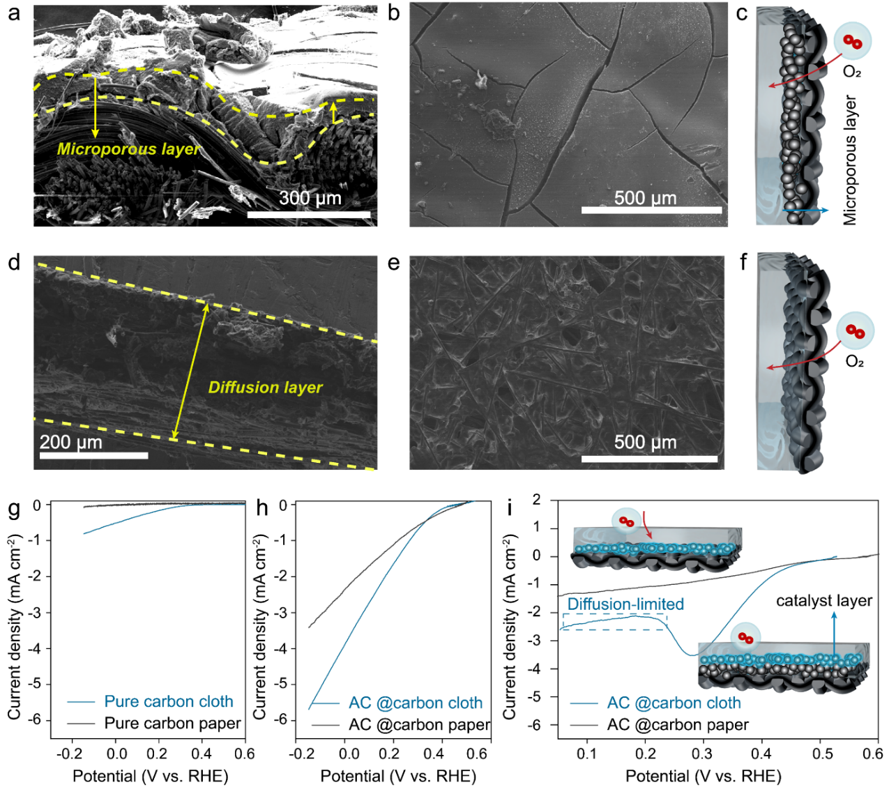 實驗利用氣體擴散電極(GDE)探討微環(huán)境對H2O2合成特性的影響。研究表明使用碳布基底相對于碳紙同樣具有更優(yōu)的法拉第效率和H2O2合成特性。相較于只具有擴散層的碳紙,碳布微孔層的存在會輔助構建反應物聚集的界面環(huán)境進而強化反應動力學;在GDE和IME測試體系中AC@carbon cloth相比于AC@ carbon paper 更優(yōu)的動力學活性證實了這一觀點。