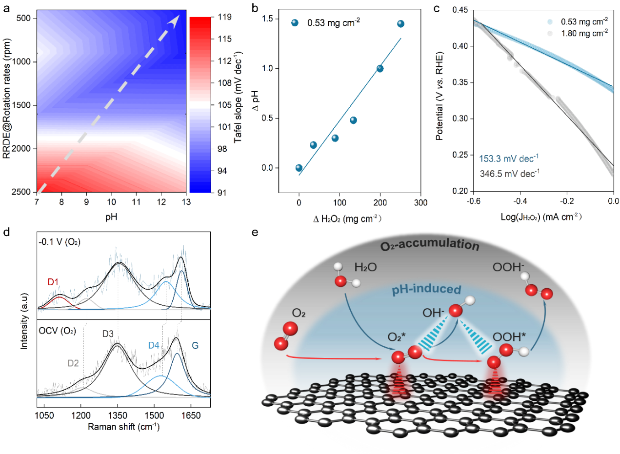 為揭示界面氧氣聚集效應,本文搭建了GDE原位反應池并開展了原位拉曼測試。發(fā)現(xiàn)相比于開路電壓,實際工況測試下D2/G、D3/G、D4/比值上升,說明本征碳缺陷上發(fā)生了ORR反應;值得注意的是,實際工況測試下出現(xiàn)了新的D1峰,這歸因于O2(*O2)吸附在sp3碳缺陷位點;結合上述電極動力學分析及傳質擴散模擬,可以明確新的D1峰可能是由富氧界面及其誘導的局域高pH穩(wěn)定了*O2中間體及抑制其質子化過程導致。
