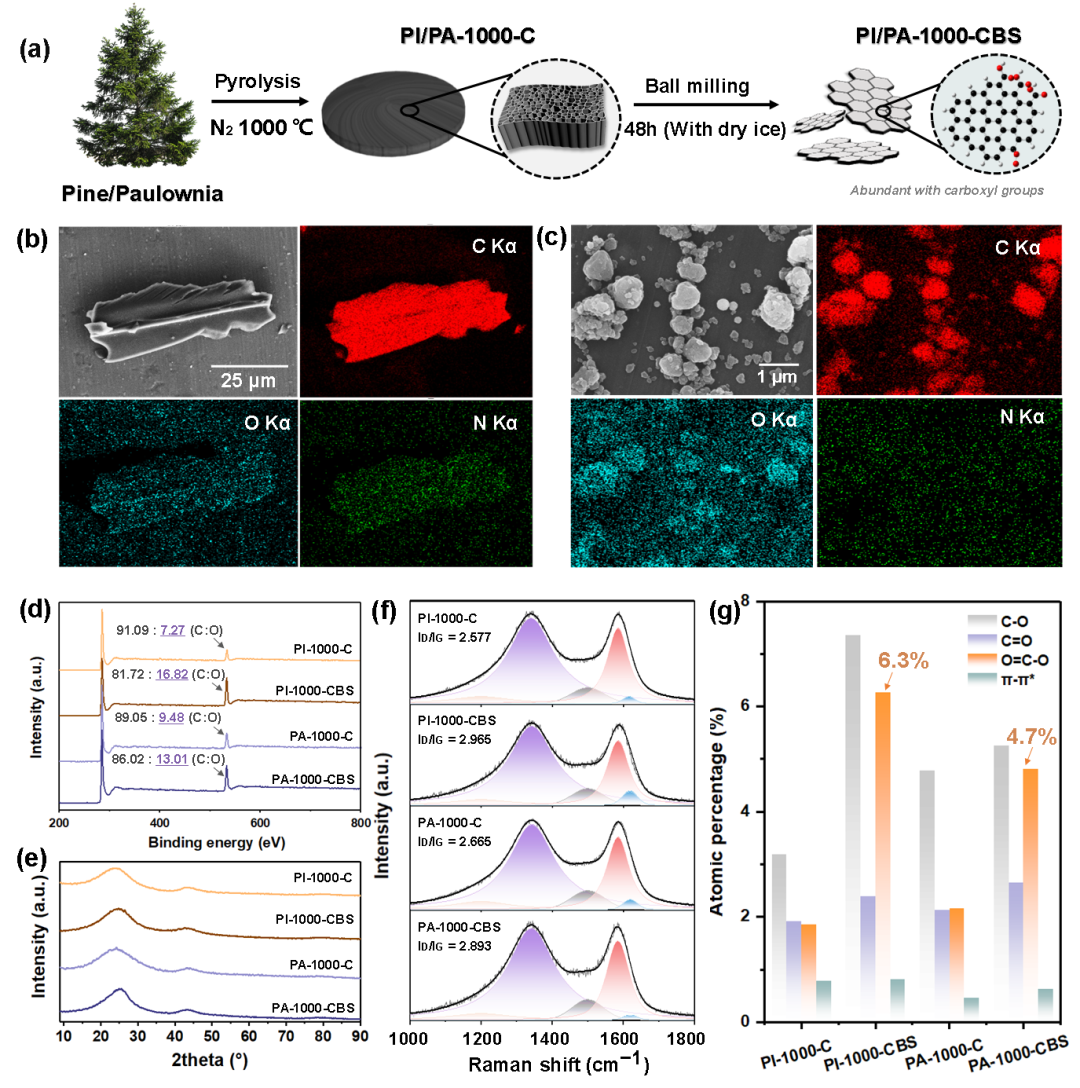 (a)OBC的制備流程;(b-c)PI-1000-c(b)和PI-1000-CBS(c)的EDS能量映射譜;(d-f)BC和OBC樣品的XPS能譜(d)、XRD圖譜(e)和拉曼光譜(f);(g)BC和OBC樣本中OGs的原子百分比。