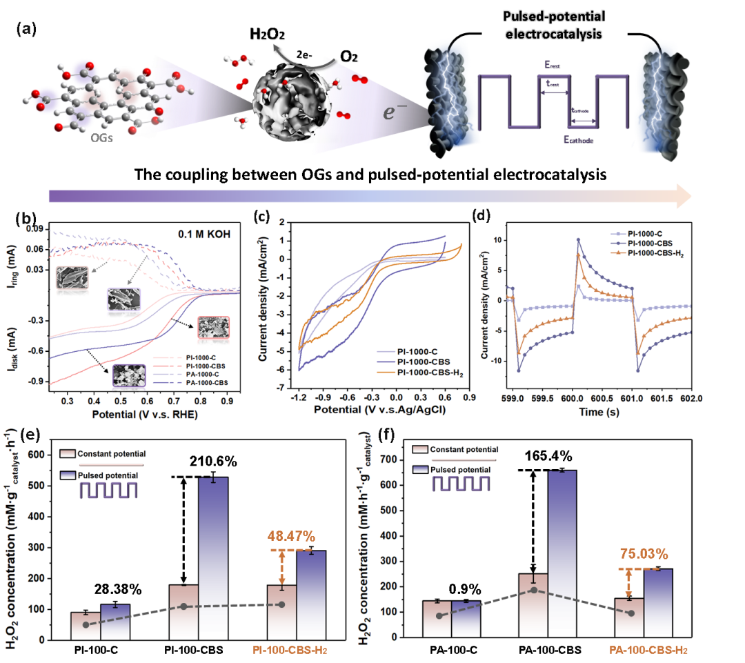 (a)通過設(shè)計OBC催化劑來提高脈沖電催化性能的方案;(b)1600 rpm時的RRDE極化曲線(實線)和0.1 M KOH中環(huán)形電極處的H2O2檢測電流(虛線);(c)在0.05M Na2SO4中,催化劑涂覆在碳纖維紙上,掃描速率為20 mV s-1時的CV曲線;(d)脈沖電位電催化下的電流響應(yīng);(e-f)使用OBC和BC樣品在恒電位電催化和脈沖電位電解中的H2O2產(chǎn)量。