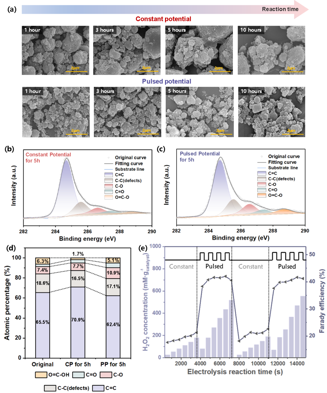 (a)PI-1000-CBS在恒定電位下的準(zhǔn)原位SEM圖像;(b-c)PI-1000-CBS在恒定電位(b)和脈沖電位電催化(c)下5小時的準(zhǔn)原位XPS反褶積C 1s光譜;(d)PI-1000-CBS在初始狀態(tài)下的官能團(tuán)含量百分比,以及在恒定電位(CP)和脈沖電位(PP)下反應(yīng)1小時;(e)H2O2產(chǎn)量及FE%在恒電位及脈沖電位下隨時間的變化,其中先在恒電位下反應(yīng)30分鐘,再切換至脈沖電位反應(yīng)30分鐘,隨后經(jīng)歷一次循環(huán)。