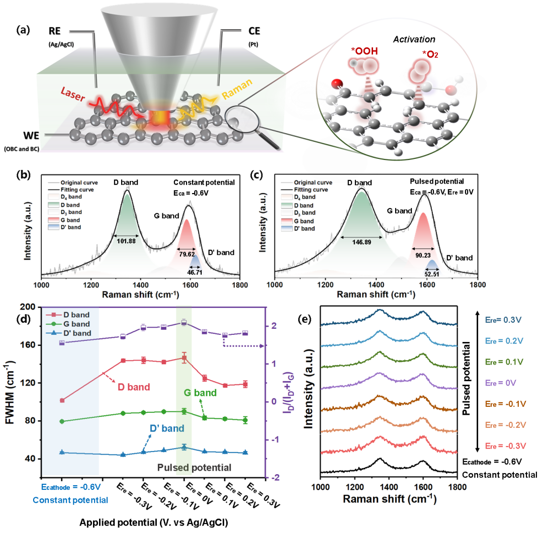 通過原位拉曼光譜測試揭示了OBC材料活性位點(diǎn)在脈沖電催化條件的動態(tài)演化以及界面反應(yīng)物種的吸附和解吸行為。其中脈沖電位的施加使OBC材料的D帶峰面積及FHWM顯著增加,表明OBC中位于邊緣或sp3雜化處的碳缺陷結(jié)構(gòu)被高度激活,從而增強(qiáng)活性位點(diǎn)和吸收中間體(*O2或*OOH)之間的相互作用;G帶和D’帶FHWM的展寬趨勢也表明脈沖電位能夠?qū)p2基面碳原子和sp2基面氧化碳原子(如邊緣的OGs)產(chǎn)生類似的激活作用。