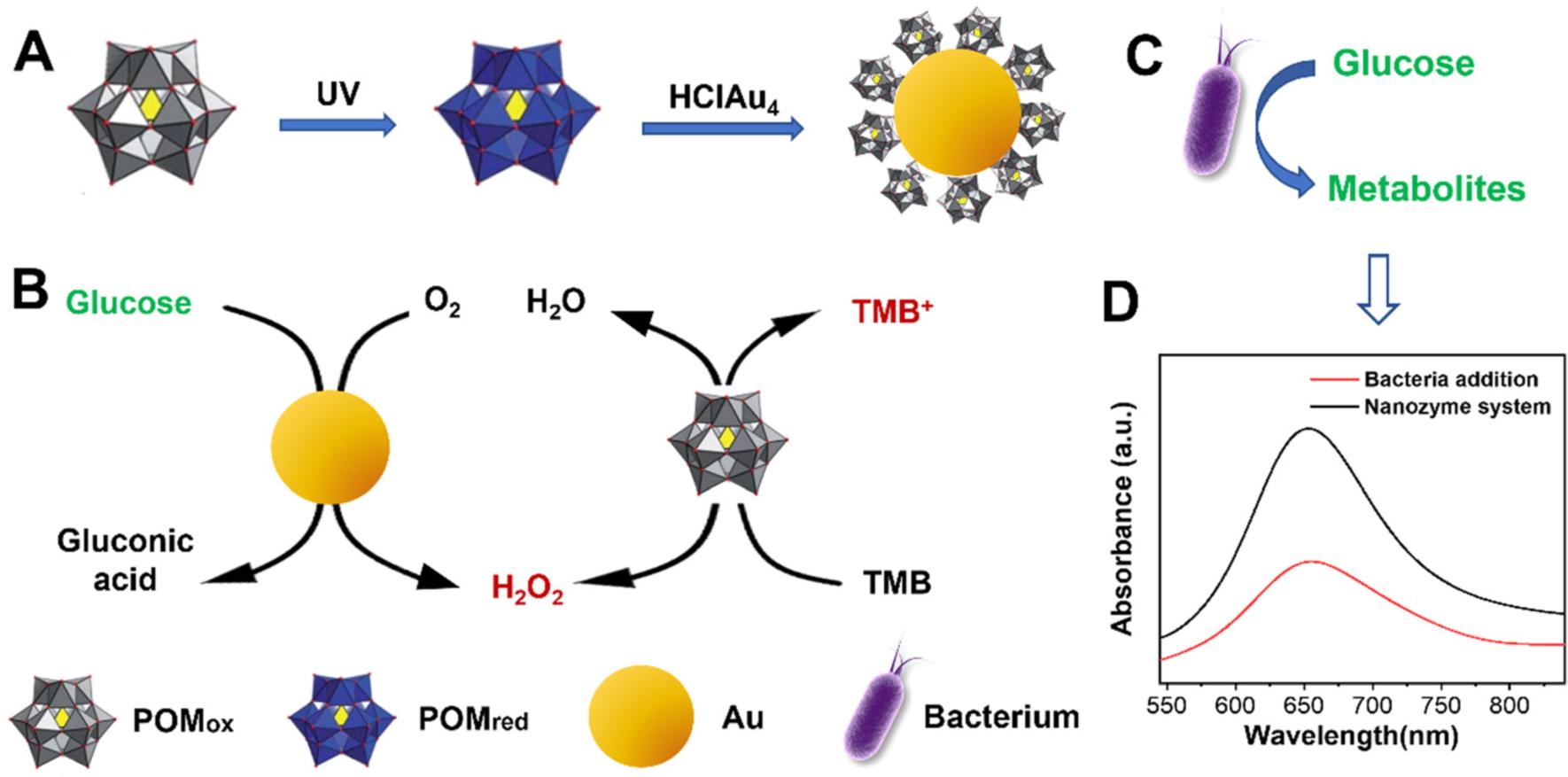 圖1納米酶級聯(lián)催化的細菌檢測原理示意圖。(A) 一步還原法制備Au@POM(B) 級聯(lián)催化Au@POM納米酶。(C) 細菌在代謝過程(D)細菌/無細菌生物體系中可見光吸收強度。