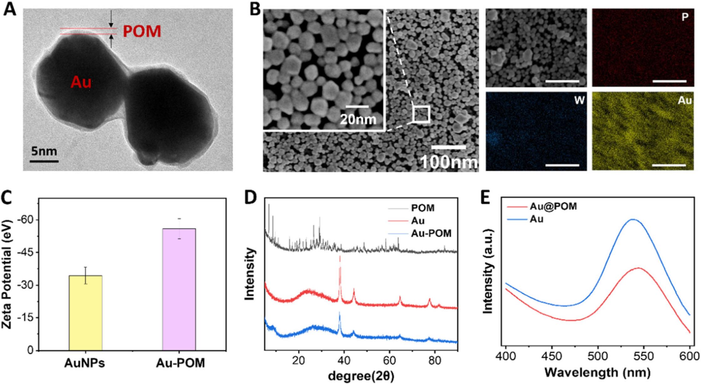 圖2 (A) Au@POM 納米顆粒TEM圖像,顆粒直徑15nm,Au核的POM薄層厚約1nm;(B)SEM圖和EDS圖譜;(C)納米顆粒ζ電位圖;(D)不同材料XRD圖;(E)Au與Au@POM的可見光吸收譜,介電常數(shù)改變導致Au@POM紅移