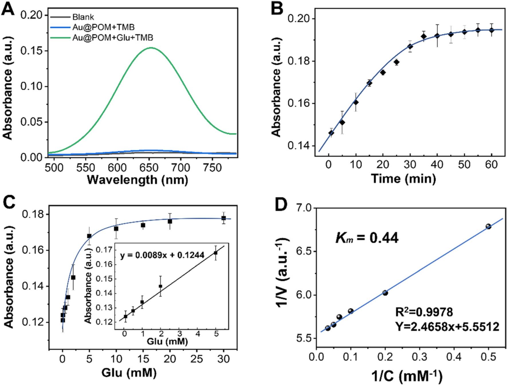 圖3 (A)不同體系可見光吸收光譜;(B)Au@POMs + Glu + TMB納米酶級聯(lián)催化體系可見光吸收譜峰與反應時間關系;(C)對葡萄糖濃度做Michaelis–Menten模型的穩(wěn)態(tài)動力學測定(TMB濃度為1.2mM);(D)納米酶級聯(lián)反應的雙倒數(shù)圖