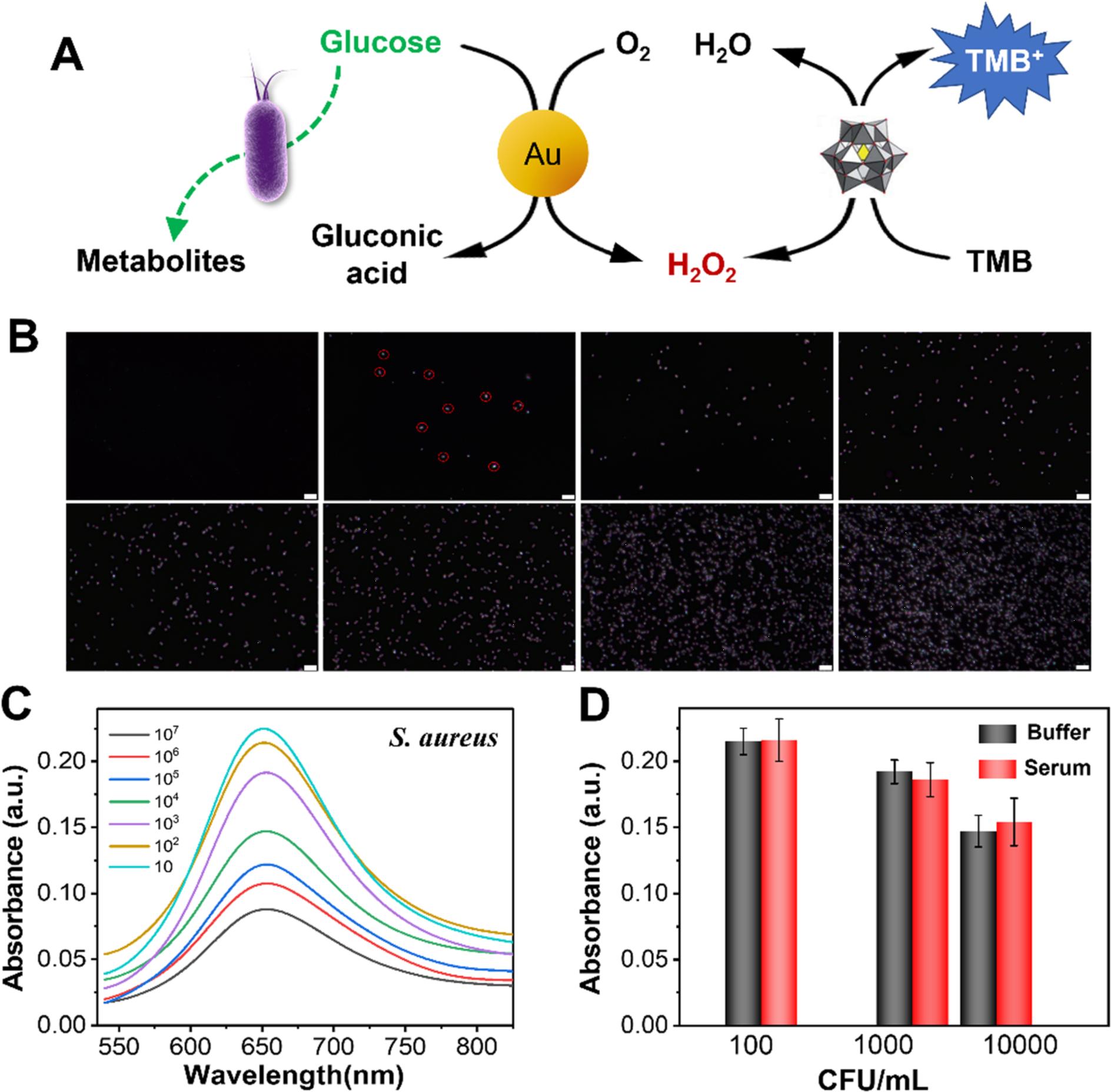 圖4 (A)納米酶級聯(lián)反應細菌檢測原理示意圖;(B)不同尺寸金黃色葡萄球菌的暗場視野圖像(0,10,102-107 CFU·mL-1);(C)加入不同含量細菌后的可見光吸收光譜圖;(D)人體血清樣品和PBS緩沖液的細菌檢測