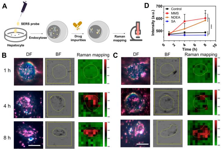 實驗時通過TAT穿透肽的小顆粒和核靶向功能進(jìn)入細(xì)胞核,將構(gòu)建的SERS細(xì)胞傳感器與藥物一起孵育。若藥物沒有遺傳毒性探針以分散狀態(tài)分布,拉曼信號弱。相反,如果藥物具有遺傳毒性發(fā)生DNA損傷,產(chǎn)生γH2AX的局部表達(dá),誘導(dǎo)探針進(jìn)一步免疫識別和聚集,在原位構(gòu)建增強(qiáng)熱點,產(chǎn)生高強(qiáng)度拉曼信號實現(xiàn)遺傳毒性鑒定。