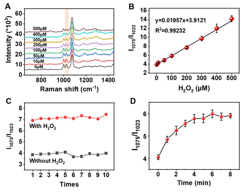 圖3 (A) 不同H2O2濃度下, B-O-H變形振動的1023 cm−1拉曼峰;(B)I1075/I1023拉曼峰強度比與H2O2濃度函數(shù)關(guān)系(C)I1075/I1023拉曼峰強度比率與時間變化關(guān)系,Au@COF為0.5nM