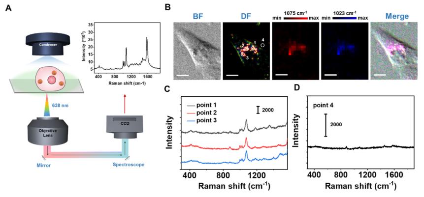 圖5 Au@COF/MPBA納米傳感器用于細(xì)胞內(nèi)成像;(A)共焦顯微鏡檢測光路示意圖;(B) MCF-7細(xì)胞在Au@COF/MPBA孵育后的明場、暗場圖像;(C-D)不同采樣點的拉曼光譜圖,1-3采樣點在1023和1075cm-1有拉曼峰,Au@COF濃度為0.25nM。