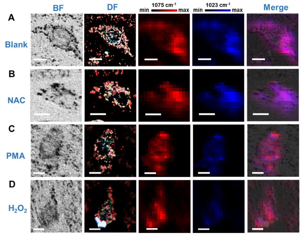 圖6 細(xì)胞內(nèi)不同藥物處理后H2O2的成像圖;(A)未處理的細(xì)胞,(B)2 mg·mL−1的NAC,(C)1 mM PMA和(D)200 mM H2O2;從左到右依次為明場(BF)圖像、暗場(DF)圖像、拉曼Mapping圖像和合成圖像。紅色圖為1075 cm−1拉曼峰Mapping圖,紅色圖為1023 cm−1拉曼峰Mapping圖。Au@COF濃度為0.5nM。