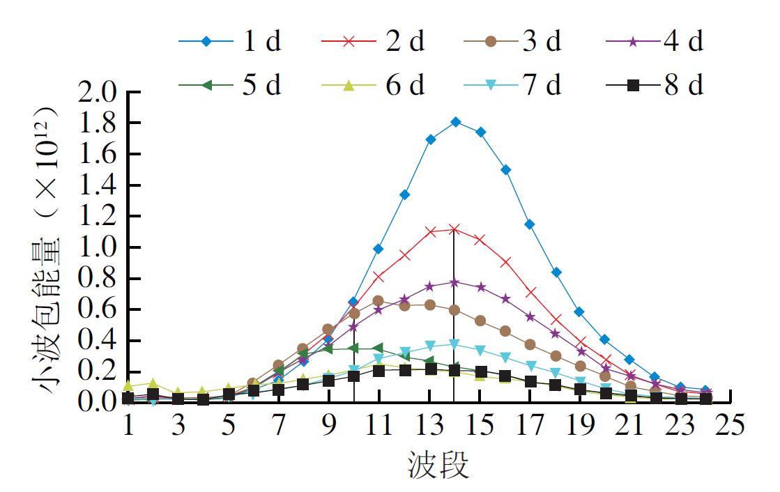 圖2 不同貯藏日特征激發(fā)波長(zhǎng)下發(fā)射光譜波段對(duì)應(yīng)的小波包能量變化曲線(劃分尺度12 nm)