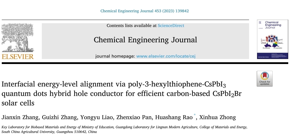 近日,華南農(nóng)業(yè)大學(xué)饒華商&鐘新華團隊在碳基無機CsPbI2Br鈣鈦礦太陽電池的空穴傳輸材料上取得重要進展,研究成果以“Interfacial energy-level alignment via poly-3-hexylthiophene-CsPbI3 quantum dots hybrid hole conductor for efficient carbon-based CsPbI2Br solar cells”為題發(fā)表在Chemical Engineering Journal(DOI:10.1016/j.cej.2022.139842)上。華南農(nóng)業(yè)大學(xué)張鍵鑫博士生為*一作者,饒華商副教授為通訊作者。