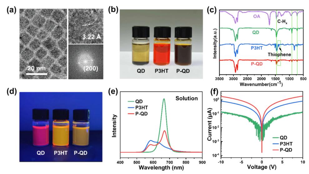 Fig. 1. (a) TEM, HRTEM, and Fast Fourier Transform (FFT) images of CsPbI3 QDs. (b) Photographs of QD, P3HT, and P-QD solutions. (c) FTIR spectra of the OA, QD, P3HT, and P-QD. (d) Pphotographs under the illumination of UV light (365 nm), and (e) PL spectra for these studied solutions. (f) I-V curves of QDs, P3HT, and P-QD films tested under dark.