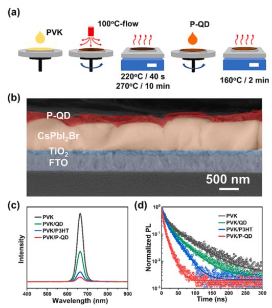 Fig. 2. (a) Schematic of fabrication processes for the CsPbI2Br film and hole conductor layer. (b) Cross-sectional SEM image of each functional layer. (c) Steady-state PL, and (d) PL delay curves of PVK, PVK/QD, PVK/P3HT, and PVK/P-QD films.