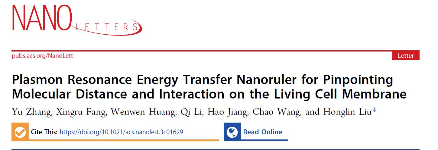首先為大家?guī)韯⒔淌趫F(tuán)隊(duì)有關(guān)細(xì)胞膜表面納米尺相關(guān)研究工作,該研究成果以“Plasmon Resonance Energy Transfer Nanoruler for Pinpointing Molecular Distance and Interaction on the Living Cell Membrane”為題發(fā)表在Nano letters 期刊中(doi.org/10.1021/acs.nanolett.3c01629)。