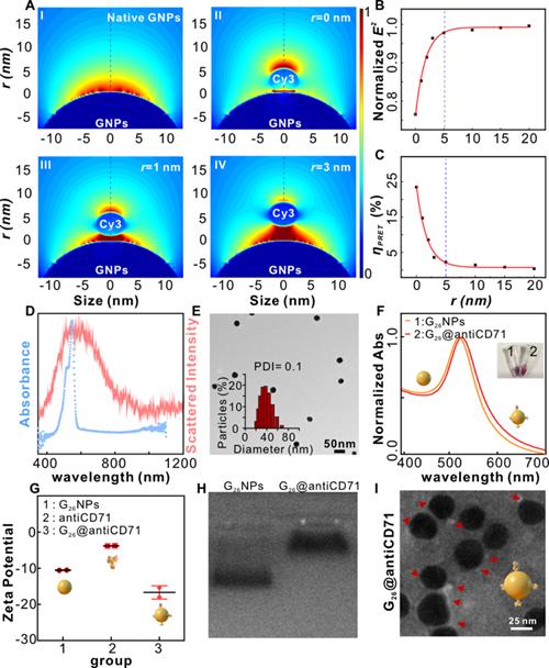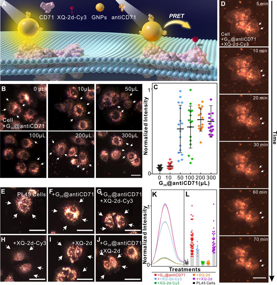 近日,課題組報(bào)道了單個(gè)納米金顆粒和單個(gè)分子偶極之間的PRET現(xiàn)象。研究團(tuán)隊(duì)使用兩種無競(jìng)爭(zhēng)性結(jié)合的配體,即適體XQ-2d-Cy3和抗體antiCD71,識(shí)別活細(xì)胞膜上同一受體蛋白CD71的不同位點(diǎn);適體攜帶小分子熒光標(biāo)簽作為能量受體,抗體攜帶單粒徑的金顆粒作為供體,觀察到了能量供體與受體之間無任何“系繩”連接的PRET現(xiàn)象?;诖嗽恚瑯?gòu)筑了靈活的PRET光學(xué)納米尺,實(shí)現(xiàn)了活細(xì)胞表面分子距離和蛋白互作的觀察與測(cè)量。有限元理論模擬和暗場(chǎng)成像實(shí)驗(yàn)結(jié)果一致表明,該P(yáng)RET納米尺在活細(xì)胞膜表面測(cè)量位點(diǎn)分離距離和蛋白互作具有可行性和穩(wěn)定性,在分析科學(xué)納米尺度測(cè)量領(lǐng)域具有廣泛的應(yīng)用前景。