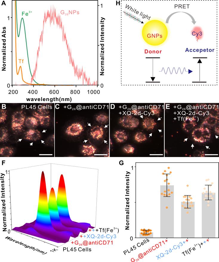 轉(zhuǎn)鐵蛋白Tf與適體XQ-2d-Cy3之間的競(jìng)爭(zhēng)性結(jié)合,抑制了適體的結(jié)合,使得活細(xì)胞膜表面降低的金顆粒散射信號(hào)有所恢復(fù),進(jìn)一步驗(yàn)證了PRET能量轉(zhuǎn)移過程的發(fā)生,展現(xiàn)了該P(yáng)RET納米尺測(cè)量分子分離距離、蛋白質(zhì)互作、分子靶標(biāo)識(shí)別等方面的可行性。