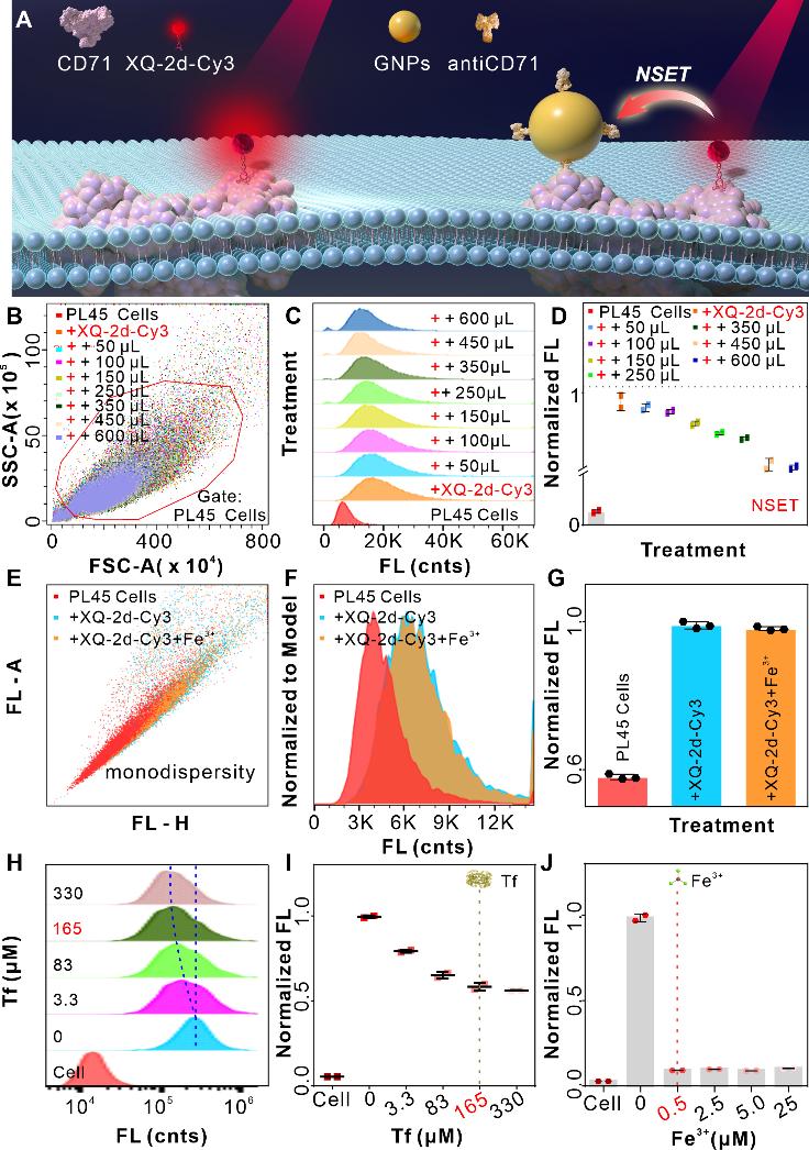 此外,研究團(tuán)隊(duì)還利用流式細(xì)胞術(shù)在活細(xì)胞膜表面觀察了同一系統(tǒng)中 與PRET相反的能量轉(zhuǎn)移過程——NSET現(xiàn)象。即單獨(dú)激發(fā)熒光標(biāo)簽(XQ-2d-Cy3)時(shí),可以反向觀察到XQ-2d-Cy3到金顆粒表面的能量轉(zhuǎn)移過程。