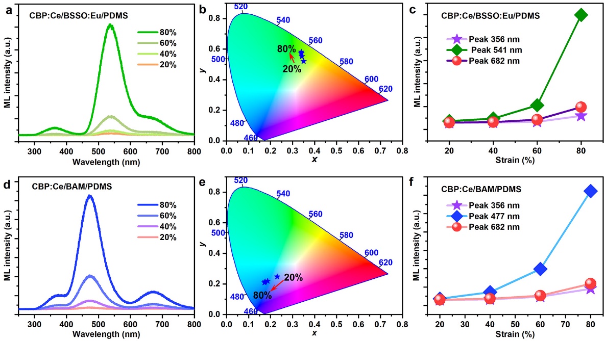 近紫外光調(diào)控光致發(fā)光材料實(shí)現(xiàn)力致發(fā)光具有明顯的應(yīng)變響應(yīng)性。如圖4a和4d所示,隨著應(yīng)變的增加,復(fù)合材料的力致發(fā)光強(qiáng)度均單調(diào)增加。此外,力致發(fā)光的顏色也發(fā)生相應(yīng)變化。由于復(fù)合材料的力致發(fā)光強(qiáng)度和力致發(fā)光顏色都與所施加應(yīng)變表現(xiàn)出一對一的對應(yīng)關(guān)系,因此基于力致發(fā)光顏色變化的應(yīng)變響應(yīng)性可用于開發(fā)可視化力學(xué)傳感設(shè)備。
