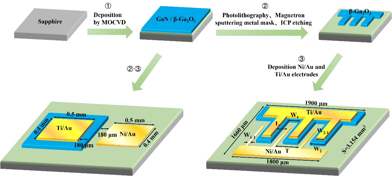 圖1. p-GaN/n-β-Ga2O3異質(zhì)結(jié)光電探測器的制備工藝流程圖。