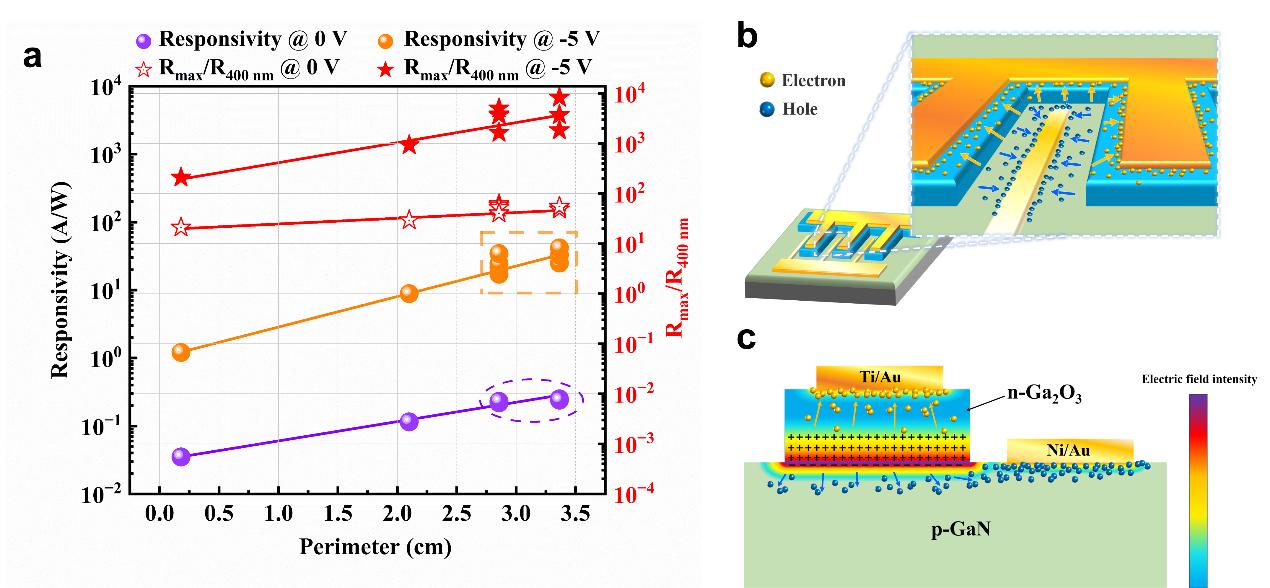 日盲(200-280 nm)紫外光電探測器(UVC PDs)在商業(yè)和軍事等領(lǐng)域都具有重要應(yīng)用。其中基于Ga2O3的UVC PD被認(rèn)為是目前*有前景的,分為金屬-半導(dǎo)體-金屬(MSM)型和PN結(jié)型。與MSM-PD相比,PN-PD由于內(nèi)置電場的存在而表現(xiàn)出優(yōu)異的瞬態(tài)性能。因此,基于β-Ga2O3的PN結(jié)型 UVC PDs近年來得到了廣泛的研究。然而,上述基于β-Ga2O3的PN結(jié)型 UVC PD通常缺乏對載流子收集和電場分布的考慮,無法實(shí)現(xiàn)更為優(yōu)異的響應(yīng)度和響應(yīng)速度。因此,探索新型的結(jié)構(gòu)以及設(shè)計(jì)相關(guān)的結(jié)構(gòu)參數(shù)以進(jìn)一步提高器件性能是非常必要的。