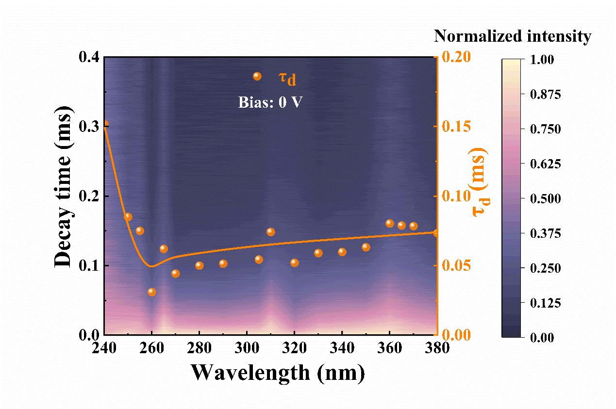 圖4顯示了PD1-3在不同激發(fā)波長下的響應(yīng)衰減過程。橙色線代表 PD1-3 的 1/e 衰減時(shí)間。在整個(gè)240 nm-380 nm波長范圍內(nèi),PD的響應(yīng)速度保持在數(shù)十微秒的量級,顯示出其超快的響應(yīng)特性。PD在260 nm光照射下表現(xiàn)出*快的響應(yīng)速度,對應(yīng)于Ga2O3的相干激發(fā)(吸收光譜為4.74 eV),消除了載流子弛豫時(shí)間。