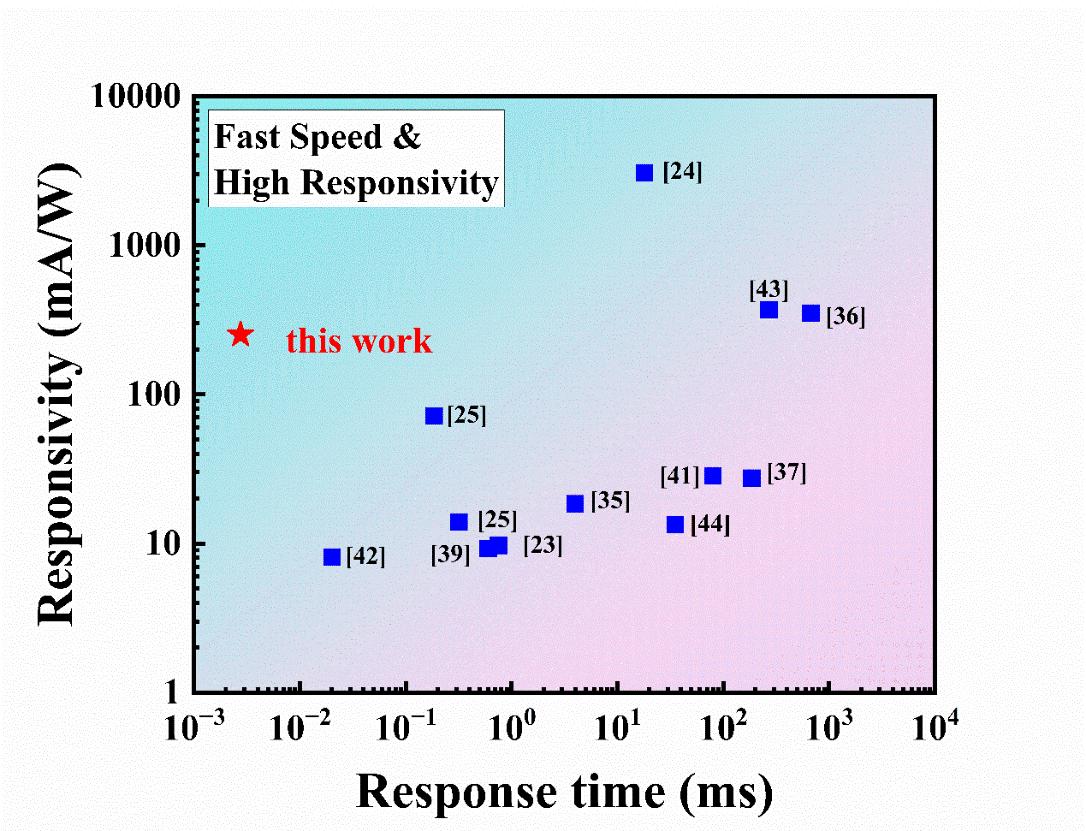 圖5. 與其他已報(bào)道的 Ga2O3 基光電探測器的響應(yīng)度和快速響應(yīng)時(shí)間的性能比較。