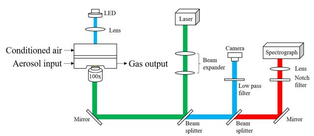 圖1.本研究中使用的氣溶膠光學(xué)鑷裝置示意圖。用霧化器霧化溶液以產(chǎn)生氣溶膠液滴。調(diào)節(jié)后的空氣流由干燥空氣流和通過(guò)水加濕的濕潤(rùn)空氣流混合而成。溫度和濕度傳感器測(cè)量調(diào)節(jié)后的空氣流進(jìn)入腔室后的溫度和相對(duì)濕度。