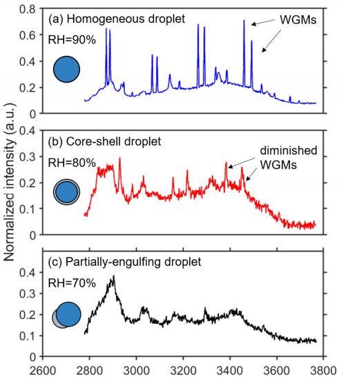 圖2. 3-甲基戊二酸(3-MGA)-II微滴的拉曼光譜:(a)一個(gè)均質(zhì)液滴(相對(duì)濕度=90%);(b)一個(gè)核殼液滴(相對(duì)濕度=80%);(c)一個(gè)部分包裹的液滴(相對(duì)濕度=70%)。WGMs(液滴-玻璃界面波)用黑色箭頭標(biāo)出。
