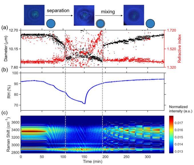 圖3. 水溶3-甲基戊二酸(3-MGA)-II的液-液相分離和混合。相態(tài)示意圖位于本圖的上方。(a) 從擬合WGMs(液滴-玻璃界面波)的拉曼位移位置確定的液滴尺寸和折射率變化的時(shí)間尺度。(b) 在濕度變化過(guò)程中,通過(guò)捕捉裝置后的相對(duì)濕度變化。(c) 時(shí)間分辨拉曼光譜。液滴內(nèi)夾雜物的隨機(jī)運(yùn)動(dòng)停止和由此導(dǎo)致的核殼結(jié)構(gòu)形成,由左側(cè)的灰色虛線(xiàn)指示。右側(cè)的灰色虛線(xiàn)作為液滴形態(tài)從相分離狀態(tài)轉(zhuǎn)變?yōu)榫酄顟B(tài)的點(diǎn)。