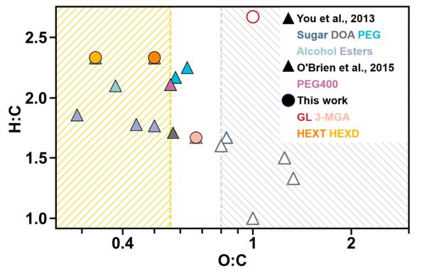 圖5. 混合有機(jī)/硫酸銨(AS)顆粒的Van Krevelen圖:實(shí)心符號(hào)表示觀(guān)察到了液-液相分離(LLPS),而空心符號(hào)表示未觀(guān)察到液-液相分離。實(shí)心三角形代表二元羧酸(DOA,包括丙二酸、蘋(píng)果酸、檸檬酸、戊二酸和二乙基丙二酸),糖類(lèi)(如脫水葡萄糖),酯類(lèi)(包括己二酸二乙酯、癸酸甲酯和聚丙烯酸酯),醇類(lèi)(包括2,5-己二醇、丙二醇和1,2,6-己三醇),聚乙二醇(包括PEG200和PEG300)數(shù)據(jù)引自于You等人的工作(2013年),硫酸銨-聚乙二醇400的合成方法引自于O'Brien等人的工作(2015年)。