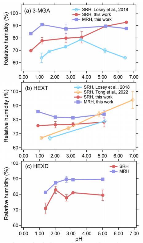 圖4.分離相對(duì)濕度(SRHs)和混合相對(duì)濕度(MRHs)作為pH值的函數(shù),對(duì)應(yīng)于(a) 3-甲基戊二酸(3-MGA)/硫酸銨(AS)系統(tǒng),(b) 己三醇(HEXT)/硫酸銨(AS)系統(tǒng),(c) 己二醇(HEXD)/硫酸銨(AS)系統(tǒng)??招膱A圈引自L(fǎng)osey等人(2018年)和Tong等人(2022年)的數(shù)據(jù)。SRHs和MRHs的誤差條基于多次測(cè)量得出。