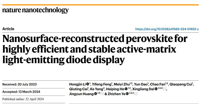 近日,浙江大學(xué)材料學(xué)院葉志鎮(zhèn)院士團(tuán)隊(duì)在有源矩陣鈣鈦礦LED領(lǐng)域取得重要進(jìn)展,研究成果以“Nanosurface-reconstructed perovskite for highly efficient and stable active-matrix light-emitting diode display”為題發(fā)表在國(guó)際著名期刊Nature Nanotechnology (doi:10.1038/s41565-024-01652-y)上。浙江大學(xué)為該論文第一單位,李紅金博士為第一作者,葉志鎮(zhèn)院士、戴興良研究員、黃靖云教授為共同通訊作者。