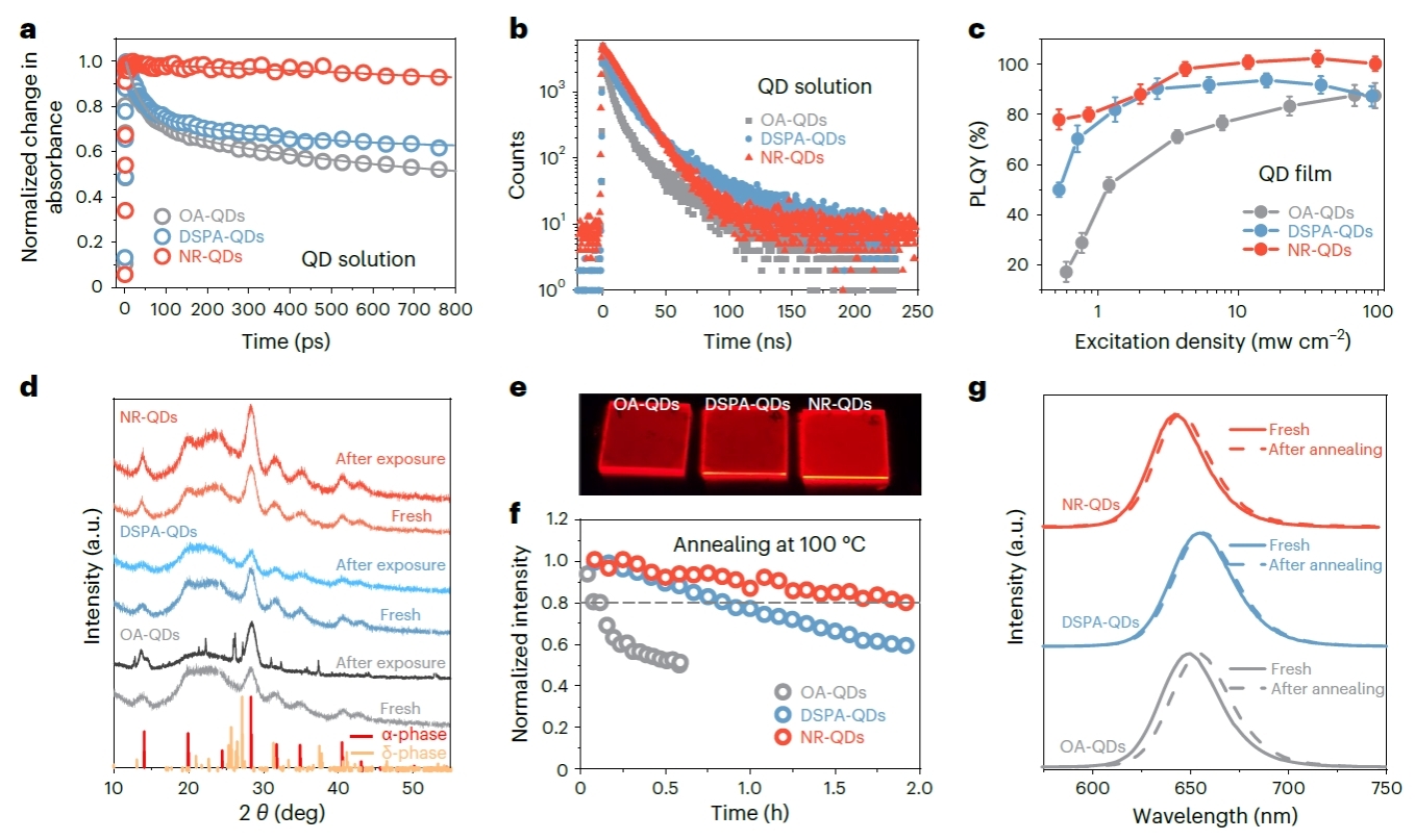 量子點(diǎn)經(jīng)過(guò)表面重構(gòu)后表面缺陷減少,從而抑制了缺陷導(dǎo)致的非輻射復(fù)合過(guò)程,提高了發(fā)光效率以及熱穩(wěn)定性(圖2)。