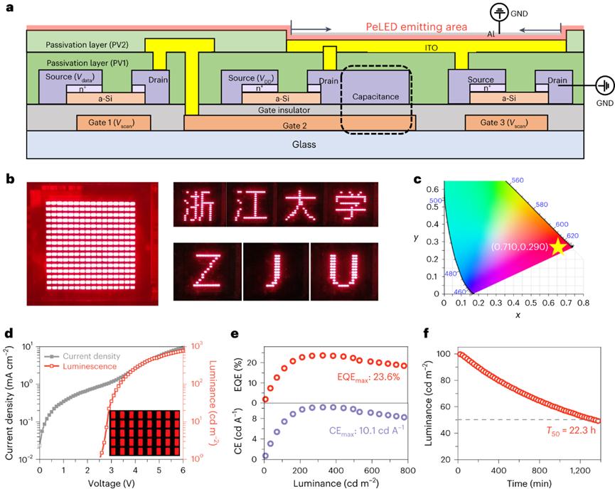 團(tuán)隊(duì)還將鈣鈦礦LED器件進(jìn)一步與薄膜晶體管背板集成,展示了一種高效、像素獨(dú)立可控、均勻發(fā)射的有源矩陣顯示器件(圖3)。有源矩陣顯示陣列實(shí)現(xiàn)了23.6%峰值EQE,10.1 cd A-1的*大電流效率和22.3 h的器件半衰期,與原型PeLED相當(dāng)。