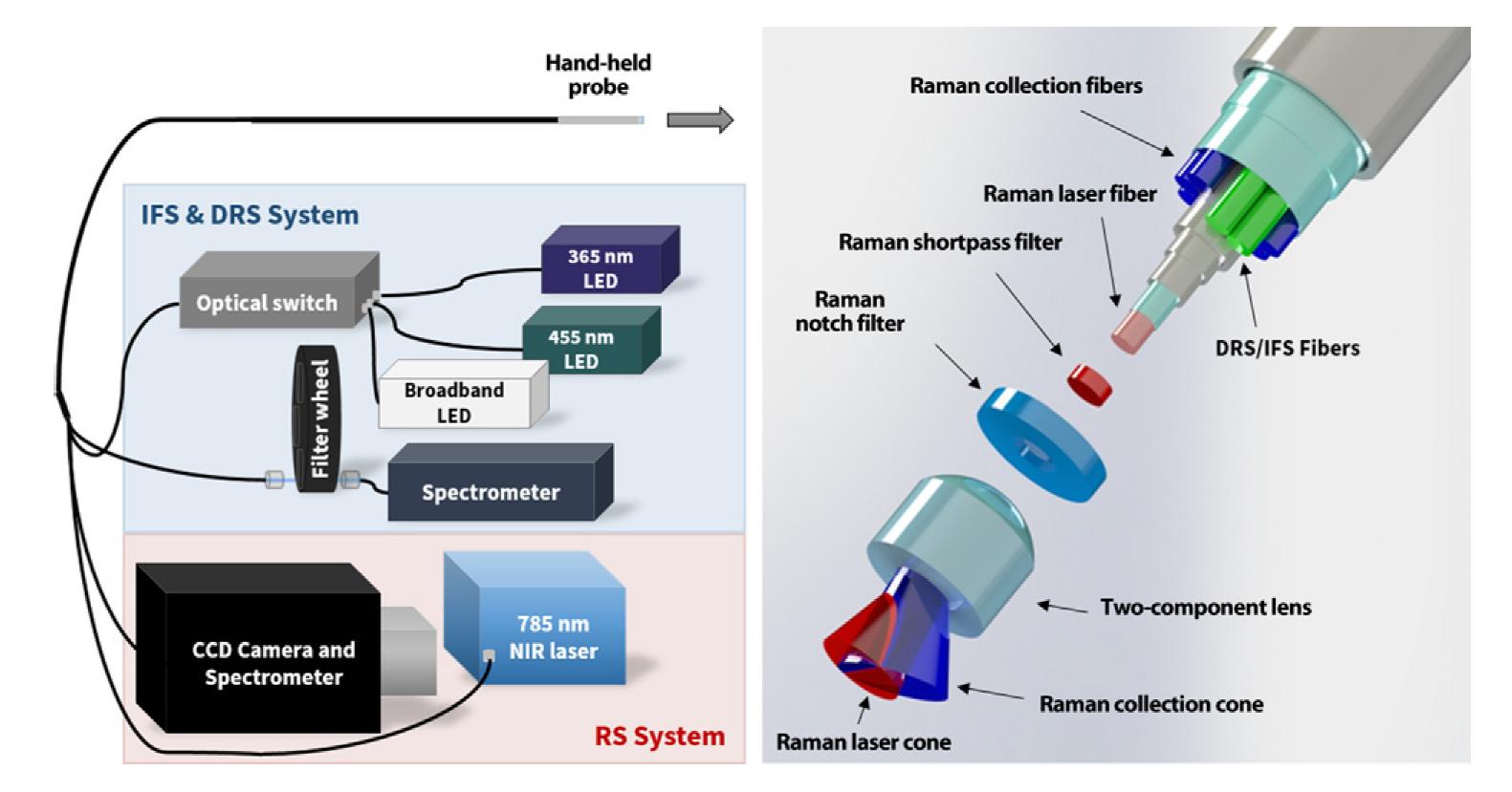 案例3:如果在手術(shù)過(guò)程中沒(méi)有檢測(cè)到所有的癌細(xì)胞,手術(shù)作為-種癌癥治療的有效性就會(huì)降低,從而導(dǎo)致復(fù)發(fā),對(duì)生存產(chǎn)生負(fù)面影響。為了在癌癥手術(shù)中*大限度地檢測(cè)癌細(xì)胞,研究人員設(shè)計(jì)了一種術(shù)中原位、無(wú)標(biāo)記、光學(xué)癌癥檢測(cè)系統(tǒng),該系統(tǒng)結(jié)合了固有熒光光譜、漫反射光譜和拉曼光譜。使用這種多模態(tài)光學(xué)癌癥檢測(cè)系統(tǒng),我們發(fā)現(xiàn)腦癌、肺癌、結(jié)腸癌和皮膚癌可以在手術(shù)中原位檢測(cè),其準(zhǔn)確性、靈敏度和特異性分別為97%、100%和93%。這種高靈敏度的光學(xué)分子成像方法可以深刻地影響廣泛的外科和無(wú)創(chuàng)介入腫瘤學(xué)的范圍程序,通過(guò)提高癌癥檢測(cè)能力,從而減輕癌癥負(fù)擔(dān),提高生存率和質(zhì)量生活[]。