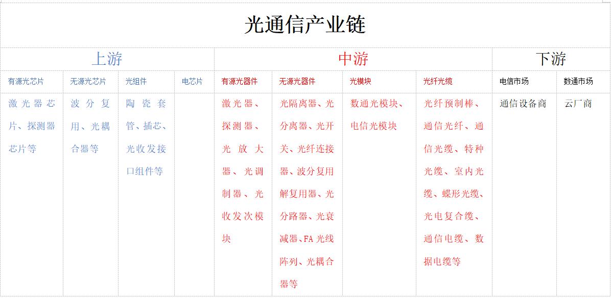 光通信產(chǎn)業(yè)鏈分上中下游,上游主要是核心零部件環(huán)節(jié)包括光芯片、光組件、電芯片,中游包括光器件、光模塊和光纖光纜,下游按應(yīng)用場(chǎng)景分為電信市場(chǎng)和數(shù)通市場(chǎng)。