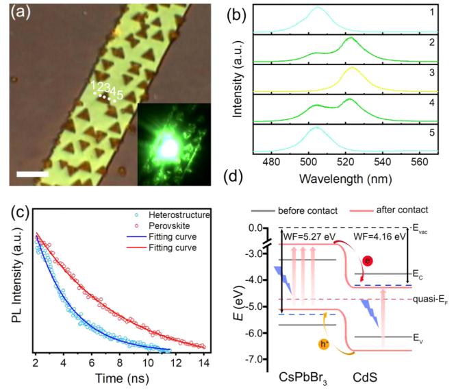 葉院士團(tuán)隊通過氣相外延生長構(gòu)建了具有Type2型能帶結(jié)構(gòu)的CdS/CsPbBr3異質(zhì)結(jié),并且通過晶格匹配限制CsPbBr3外延生長取向,實現(xiàn)了在CdS納米帶表面外延取向均一的CsPbBr3金字塔結(jié)構(gòu)。該工作通過觀測CdS/CsPbBr3異質(zhì)界面和純CsPbBr3的熒光壽命證明了CdS/CsPbBr3異質(zhì)界面對光生載流子有分離作用,可以抑制輻射復(fù)合過程。此外,理論計算表明CdS納米帶/CsPbBr3金字塔結(jié)構(gòu)可將入射光約束在異質(zhì)界面區(qū)域。CdS/CsPbBr3異質(zhì)結(jié)構(gòu)的這些特性對提升光電探測性能具有重要幫助。*終,基于CdS/CsPbBr3異質(zhì)結(jié)的光電探測器表現(xiàn)出超高的光電響應(yīng)能力,包括:2.14×105開關(guān)比、4.07×104 A/W響應(yīng)度、1.36×1013 Jones探測率等。
