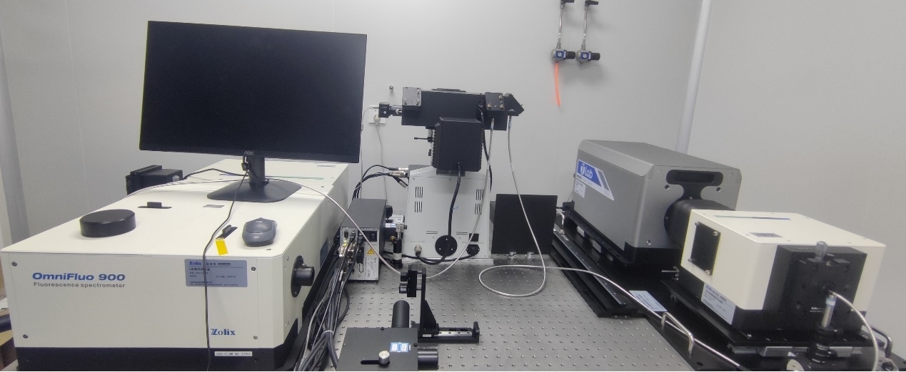 下圖為秦川江研究員課題組的OmniFluo900系列穩(wěn)態(tài)瞬態(tài)熒光光譜儀,耦合正置科研級(jí)顯微鏡,條紋相機(jī)及飛秒激光器。該套系統(tǒng)主要用于雜化半導(dǎo)體和有機(jī)光電材料與器件的研究。