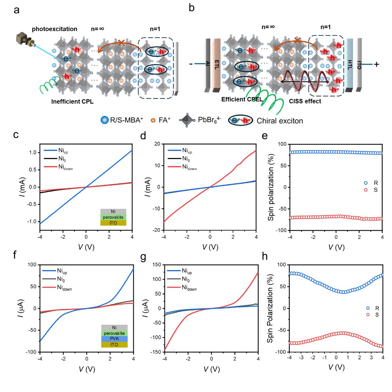同時(shí)該團(tuán)隊(duì)通過磁場(chǎng)依賴光譜和自旋軌道理論的結(jié)合,進(jìn)一步量化了手性鈣鈦礦(R/S-MBA?FA?Pb?Br??)中的自旋行為,結(jié)果表明材料的載流子自旋壽命達(dá)20 ps。磁場(chǎng)作用下,自旋注入與產(chǎn)生的圓偏振發(fā)射之間呈現(xiàn)直接相關(guān)關(guān)系。